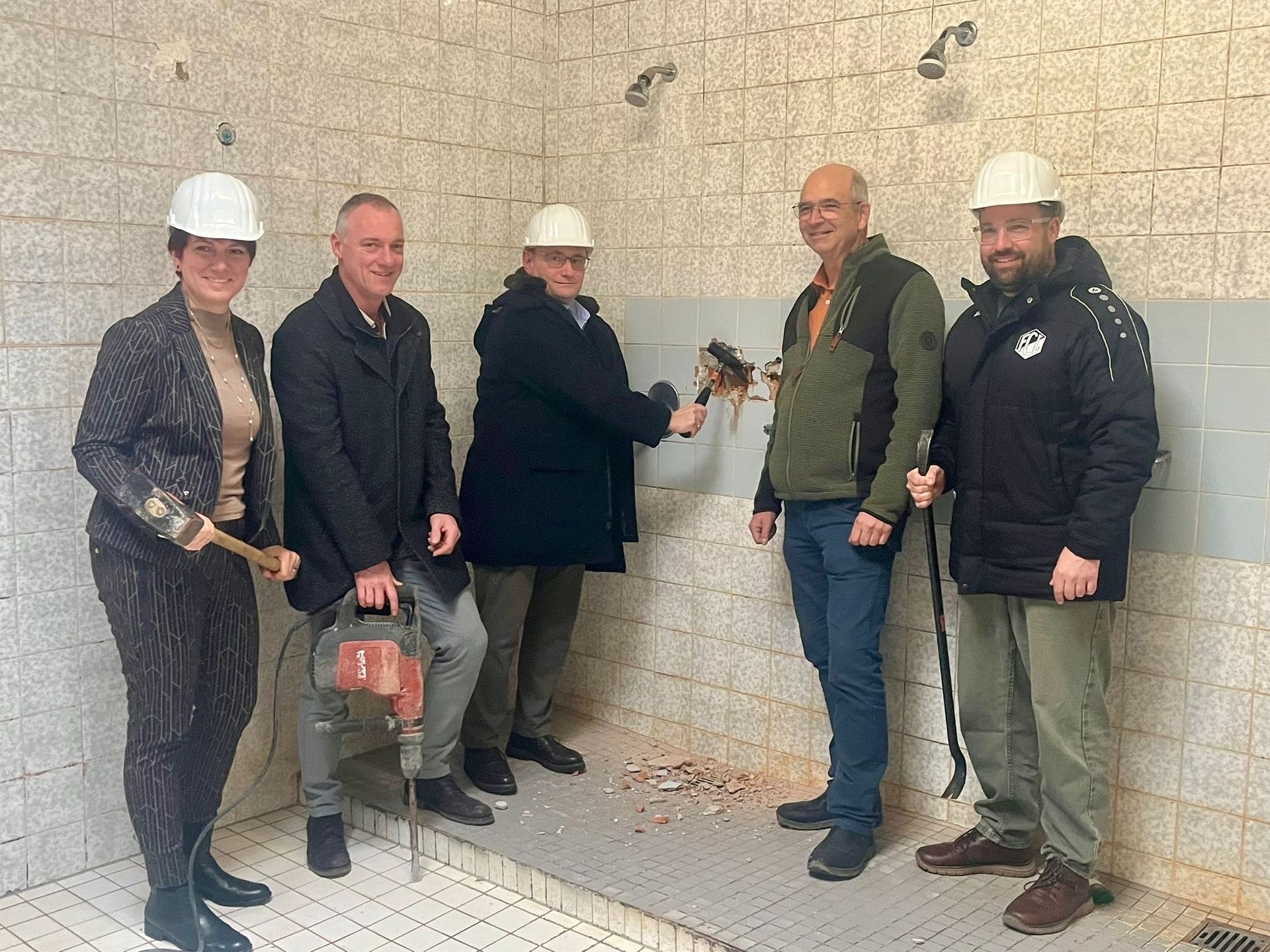 Spatenstich stehenden Ersatzneubau der Umkleidekabinen. Bürgermeisterin Müller und alle